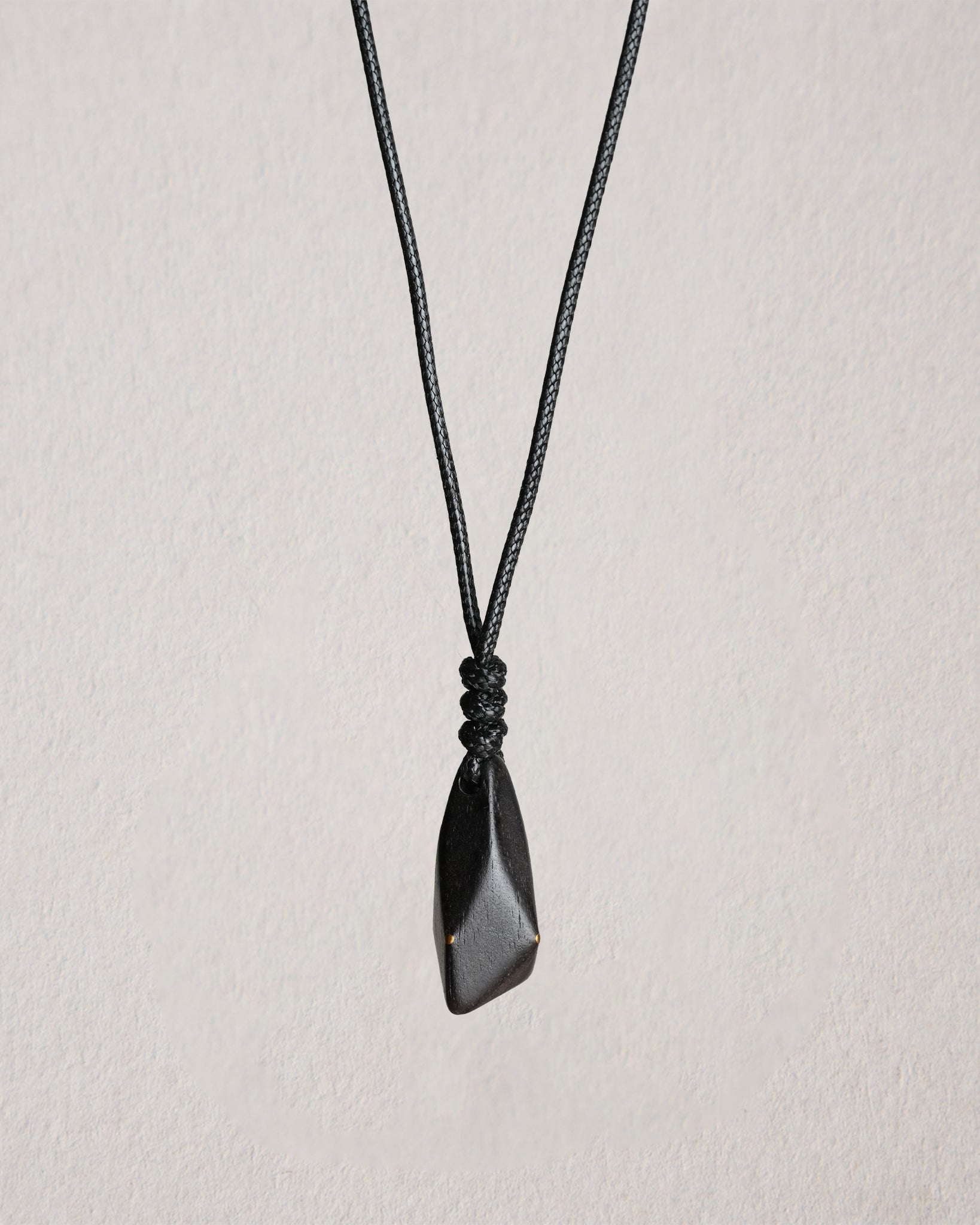 geometric cut pendant with brass inlays, crafted from ebony wood, brass, and wax cord.